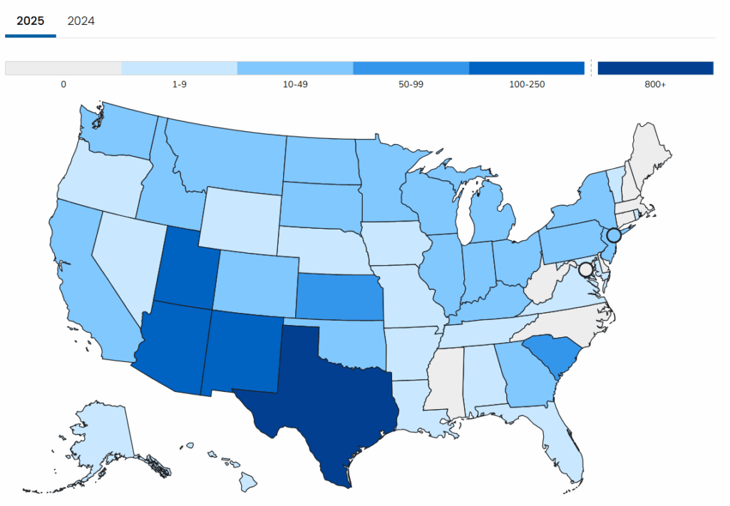 Cases of measles in the United States during the year 2025, updated as of December 2, 2025. (CDC)